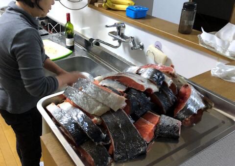 北海道の鮭はうまいからね・・ もらった鮭、ガンガンおろして
